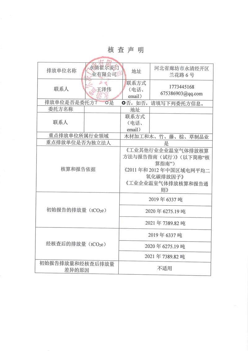 永清霍尔茨门业有限公司核查声明