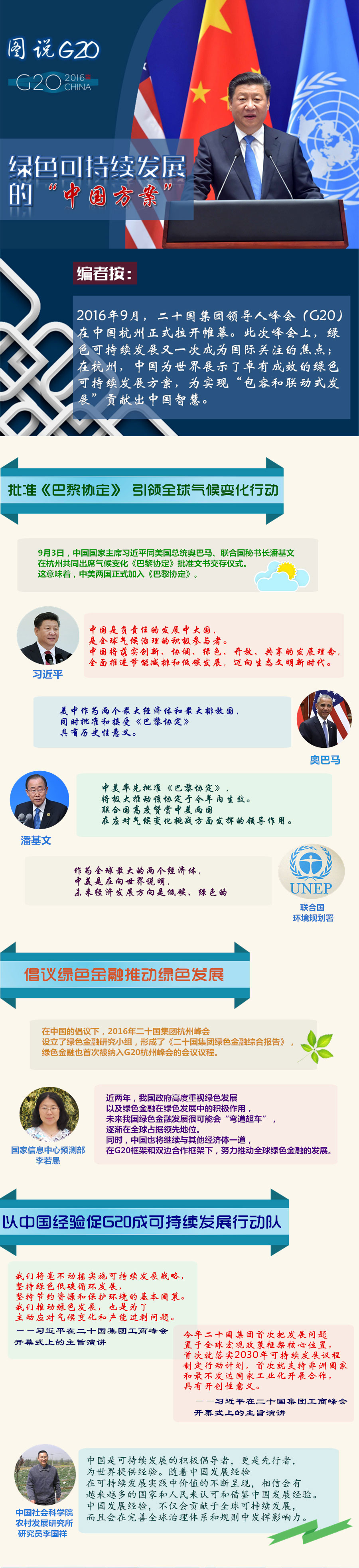 本届G20峰会首次将绿色金融纳入议题,中国作为轮值主席国,倡议成立了绿色金融研究小组,由中国人民银行和英格兰银行共同主持,联合国的环境规划署担任秘书处,小组包括80多位成员。