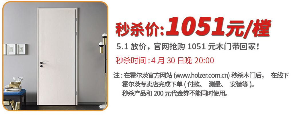 活动一:4月30日20:00整,霍尔茨开启热款T型门(11-00)限量秒杀活动。此次活动,共推出510樘木门,将以1051元/樘的秒杀价格进行放送(不限花色,不含五金)。用户需提前在霍尔茨官方网站(www.koreanshowroom.com)填写个人信息(姓名、手机号码、所在地址),秒杀成功后,在线下霍尔茨专卖店进行付款、测量、安装等。