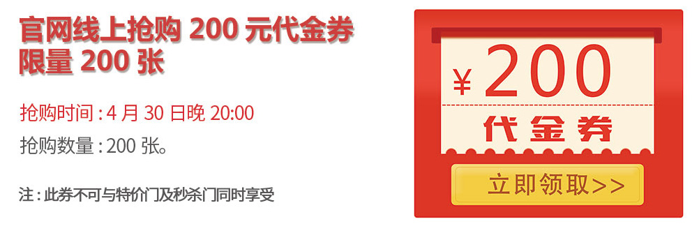活动二:4月30日20:00整,霍尔茨官网线上抢购200元代金券,限量200张。用户只需前往霍尔茨官网,进入专题页面参与活动,填写个人信息(姓名、手机号码、所在地址),将生成代金券验证码。用户凭该验证码进行到店消费,每个验证码限用一次限用一张。仅限木门及家具使用,特价及秒杀产品除外。